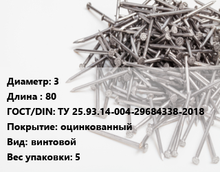 Гвоздь 3х80 ГОСТ: ТУ 25.93.14-004-29684338-2018 оцинкованный винтовой 5