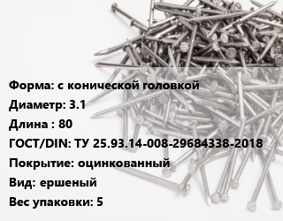 Гвоздь с конической головкой 3.1х80 ГОСТ: ТУ 25.93.14-008-29684338-2018 оцинкованный ершеный 5