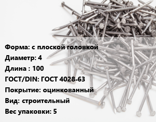 Гвоздь с плоской головкой 4х100 ГОСТ: ГОСТ 4028-63 оцинкованный строительный 5