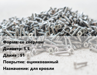 Шуруп со сверлом 5.5х51 оцинкованный для кровли, шт цена от 3.25 Тг / кг, где купить, условия доставки в Шымкенте и Южно-Казахстанской области