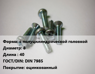 Винт с полуцилиндрической головкой 8х40 DIN 7985 оцинкованный
