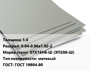 Лист нержавеющий 1.4 0.94-0.96х1.92-2 Сталь: 07Х16Н6-Ш (ЭП288-Ш) Тип:матовый ГОСТ 19904-90