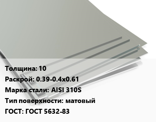 Лист нержавеющий 10 0.39-0.4х0.61 Сталь: AISI 310S Тип:матовый ГОСТ 5632-83